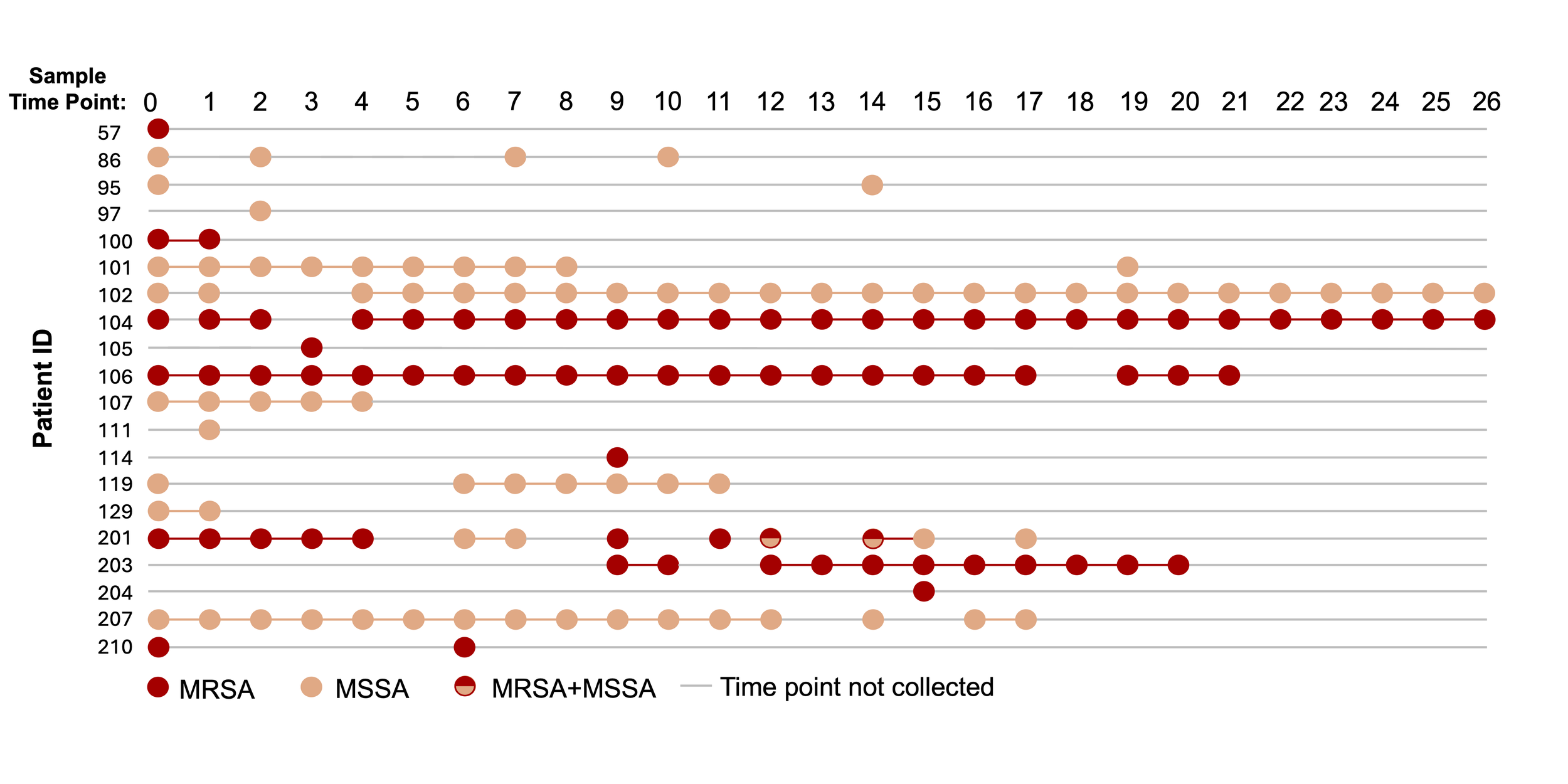 Many medical devices become asymptomatically colonized with pathogens. Chronic colonization increases the risk of developing symptomatic infection. Our genomic studies with Staphylococcus aureus and Klebsiella pneumonia and other microbes, indicate that these microbes acquire genomic changes that promote tissue tropism and increase pathogenic potential (figure generated by rotation student Alexandra Serrato). We use a combination of epidemiology, genomics and bioinformatics, patient samples, and model systems to understand how bacteria evolve to persist asymptomatically long-term and adapt to become more pathogenic to help to guide the development of more effective prevention and treatment strategies.